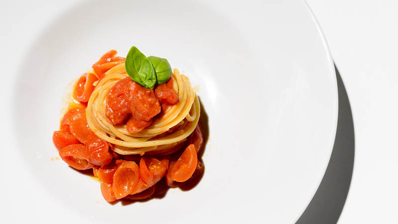 spaghetti pasta with oven-baked cherry tomatoes, basil, and Evo oil