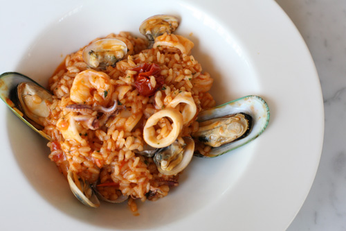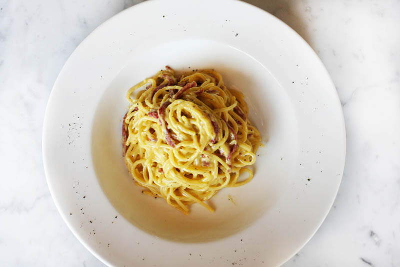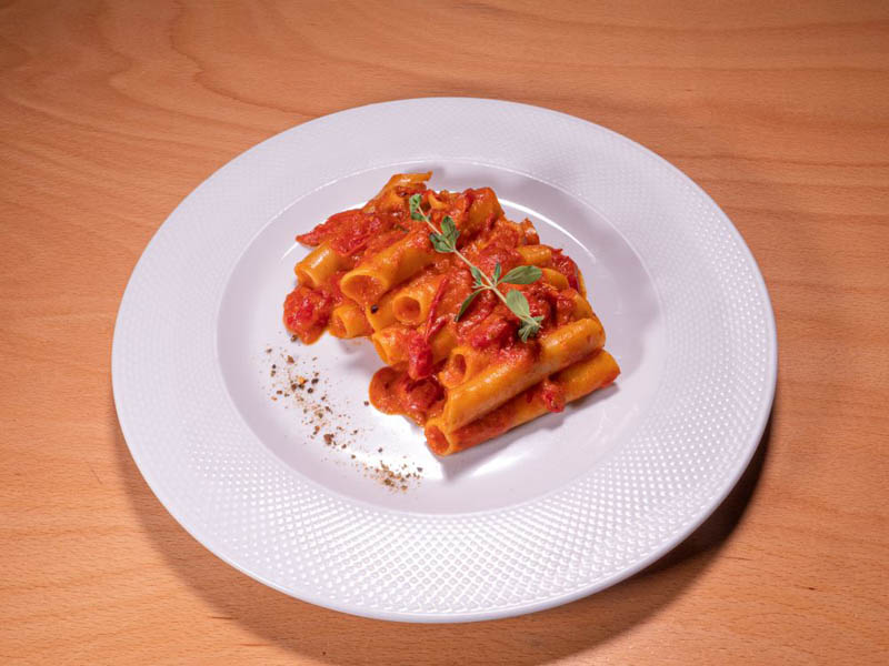penne pasta with cherry tomato sauce, pecorino Romano cheese, grana padano cheese, chilli and basil