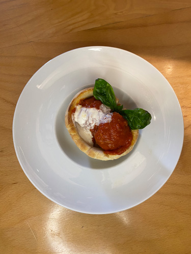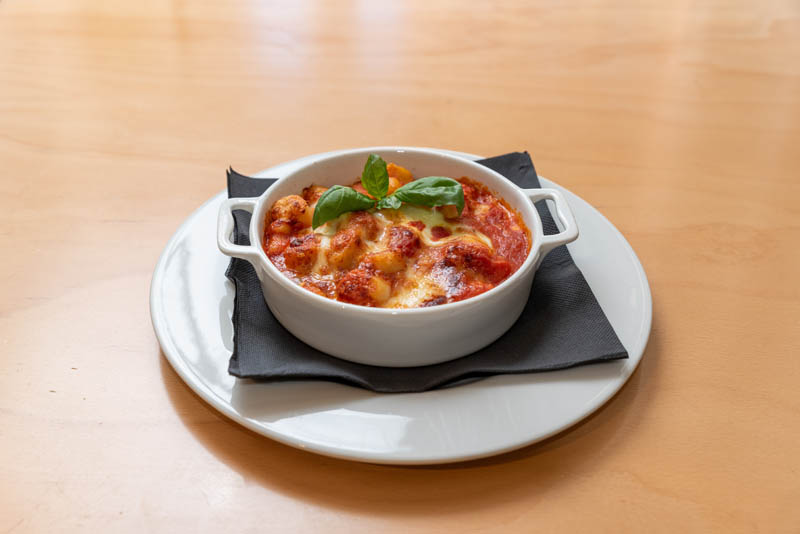 oven grated home made ricotta cheese gnocchi with tomato sauce, basil, mozzarella cheese and grana padano cheese