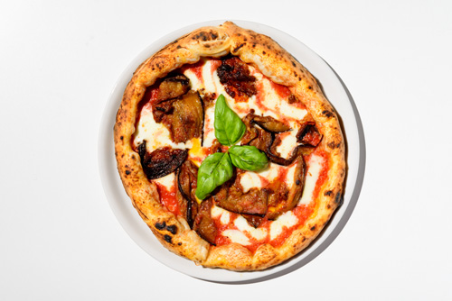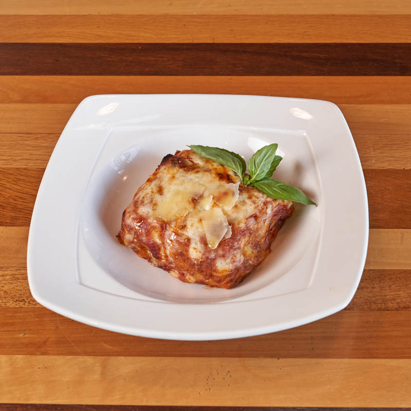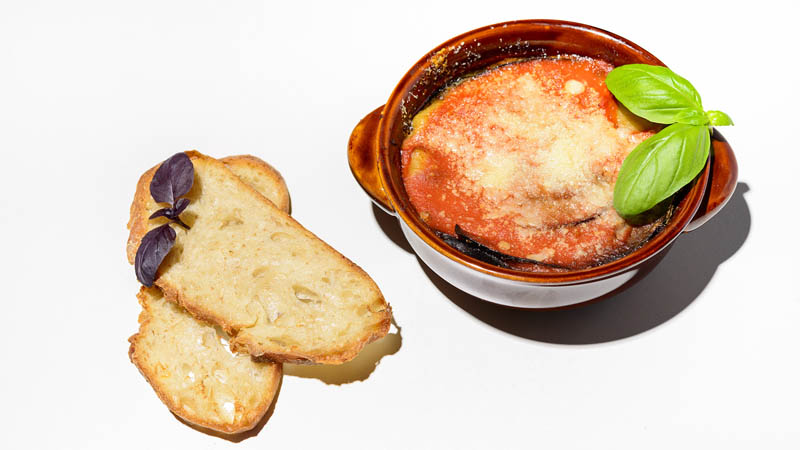 tomato sauce, mozzarella, layers of baked eggplant (parmigiana style), basil and EVO oil