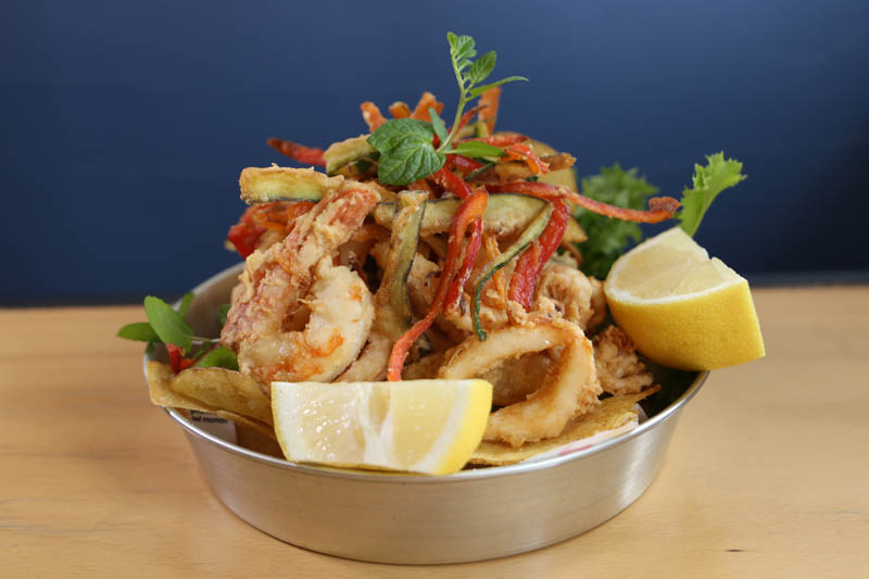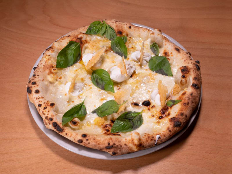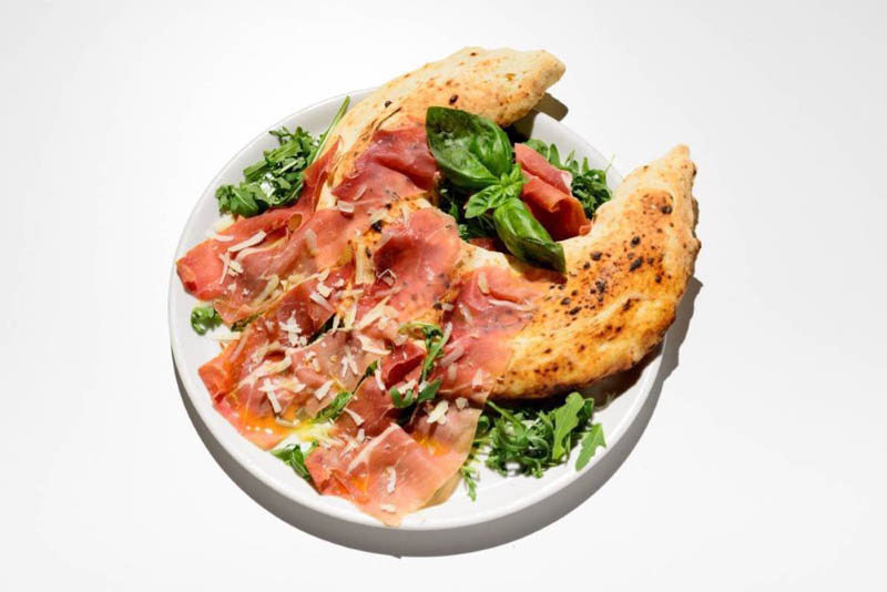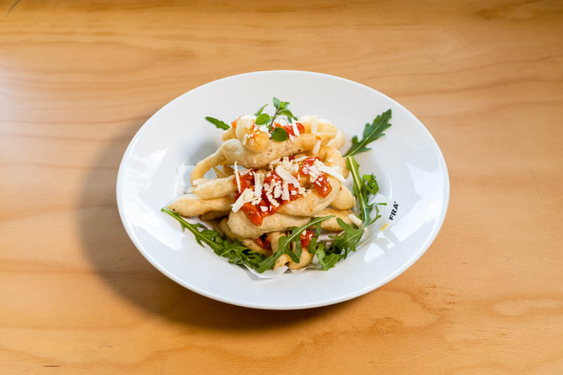 fried pizza dough delights served with red and yellow cherry tomatoes, arugula, pecorino Romano cheese flakes, basil and EVO oil