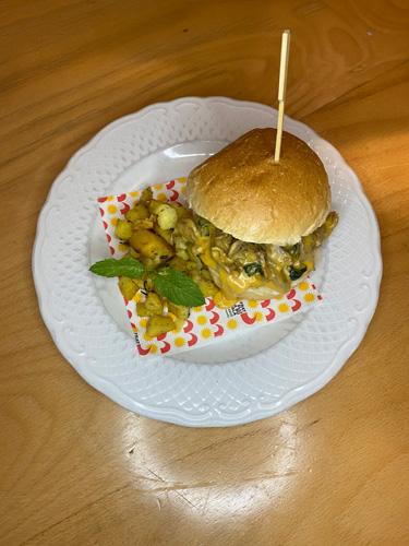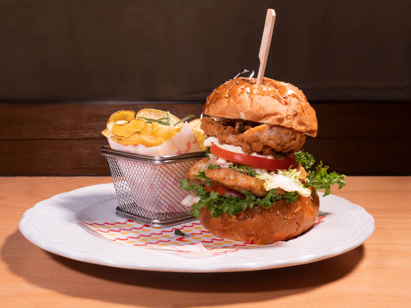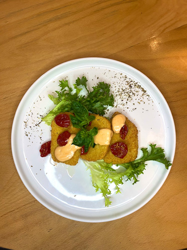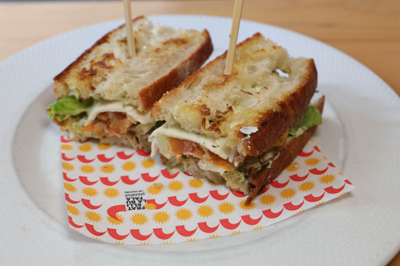 Homemade toasted bread filled with breaded and fried heirloom tomato, provola cheese, crispy lettuce, basil mayonnaise, and extra virgin olive oil