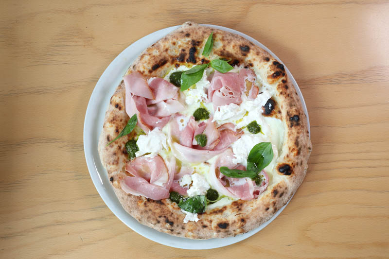 mozzarella cheese, homemade basil pesto, red and yellow cherry tomatoes, basil and EVO oil