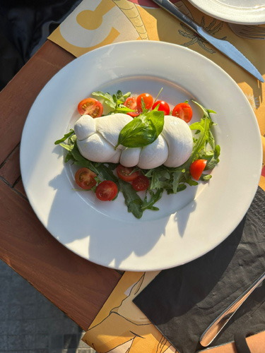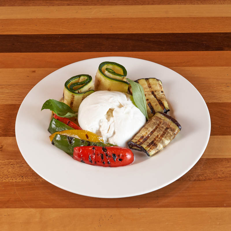 burrata cheese (125 gr) served with arugula and cherry tomatoes OR grilled seasonal vegetables