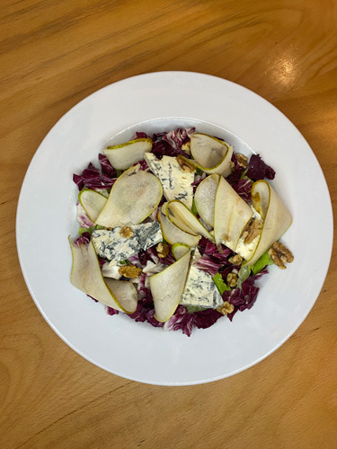 red cabage, romaine lettuce, pears, blue cheese, walnuts, and honey and EVO oil