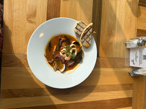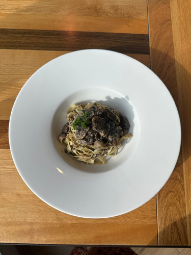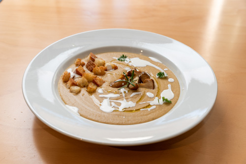 chickpea and porcini mushroom velouté served with homemade bread croutons and EVO oil
